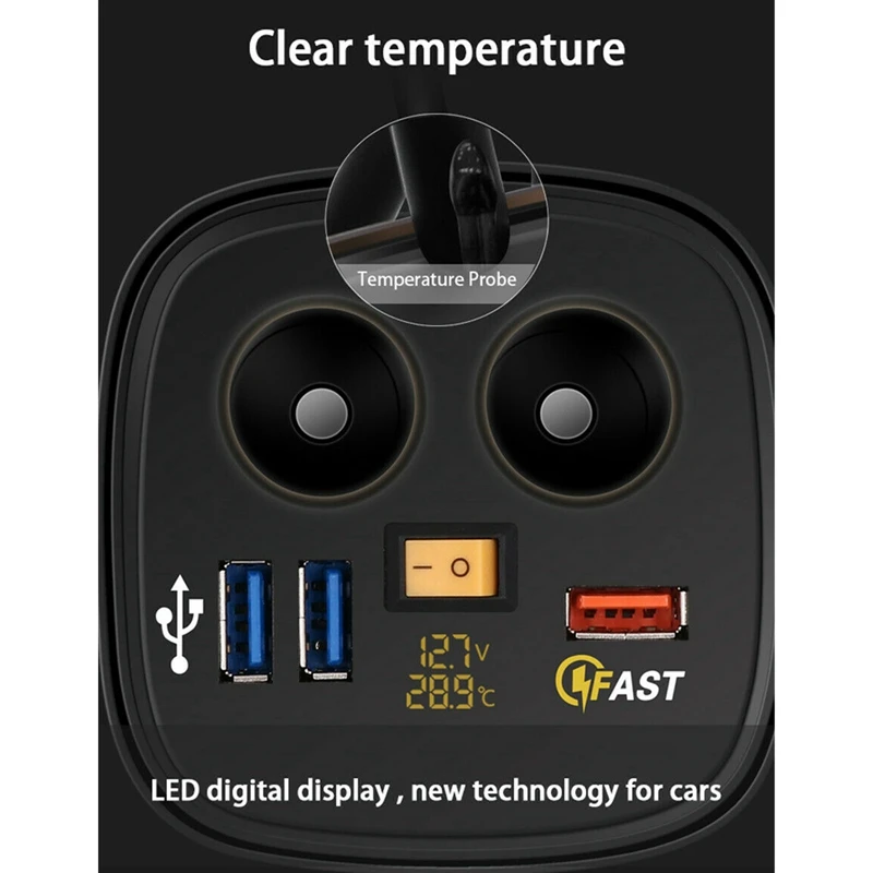 2 гнезда прикуривателя, двойное зарядное устройство USB, супер быстрое зарядное устройство USB, дисплей напряжения, дисплей температуры/переключатель вкл./выкл.