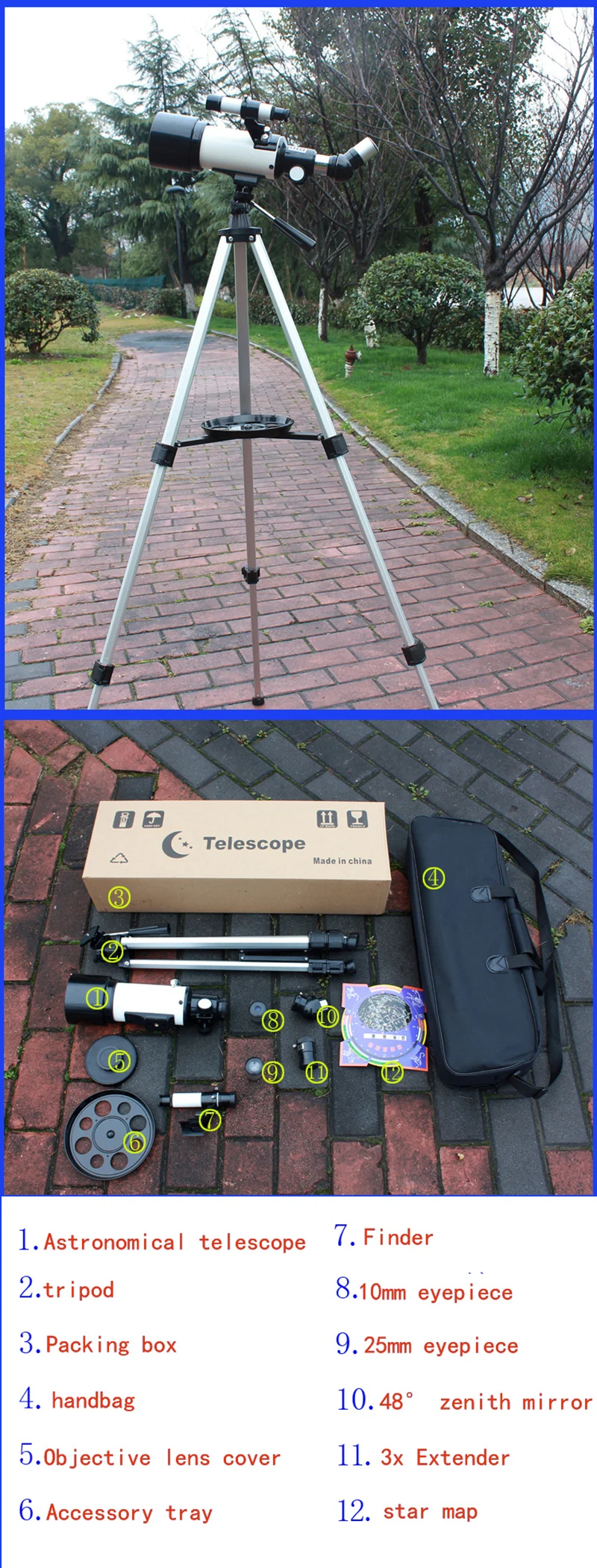 Астрономический телескоп для наблюдения за звездами 40070 монокулярный бинокль пейзажные линзы для входа на открытом воздухе профессиональные зрительные области 1. Материал: алюминиевый сплав и пластик. Прочный светильник весовой и переносной. 2. Сборный алюминиевый компактный фотографический штатив обеспечивает стабильную платформу. Складной штатив. 3. Простая установка без инструментов. 4. Все стеклянные оптические элементы с покрытием для четких, четких изображений. 5. Телескоп и штатив помещаются в индивидуальной коробке для удобства путешествий и хранения. 6. Он может соответствовать SLR.(Вы должны купить адаптер) 7. Лучший подарок для друзей, детей. (Внимание: никогда не пытайтесь наблюдать за солнцем непосредственно через телескоп, это сильно повредит ваш глаз!) Посылка включает: 1 х 40070 трубка телескопа 1x1,25 дюйма 10 мм окуляр 1x1,25 дюйма 25 мм окуляр 1 x область поиска 1x1,25 дюйма 3X линза Барлоу 1x1,25 дюйма 1,5x монтируемый окуляр (у телескопа есть всего 90 дег) 1 х Алюминиевый Штатив 1 x ручка замка 1 х Руководство пользователя