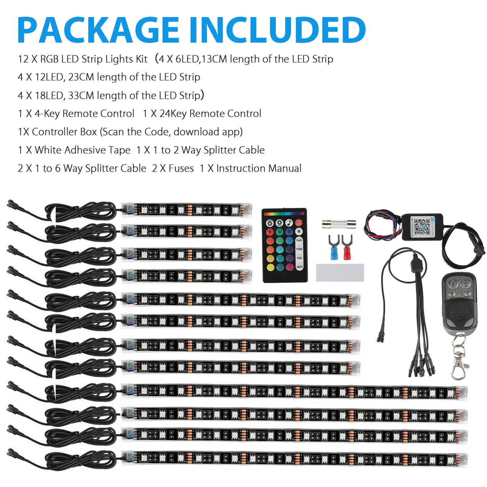 Набор светодиодных лент 12 X RGB (4X6 светодиодов, 13 см длина светодиодной ленты; 4X12 светодиодов, 23 см длина светодиодной ленты; 4X18 светодиодов, 33 см Длина светодиодной ленты) 1X4 пульта дистанционного управления Управление 1 X пульт дистанционного управления с 24 клавишами 1X блок контроллера (сканирование кода, загрузка приложения) 1 х белая клейкая лента 1X1-2 разветвитель кабеля 2X1 до 6 способ сплиттер кабель 2 предохранителя Руководство по эксплуатации-1 шт.