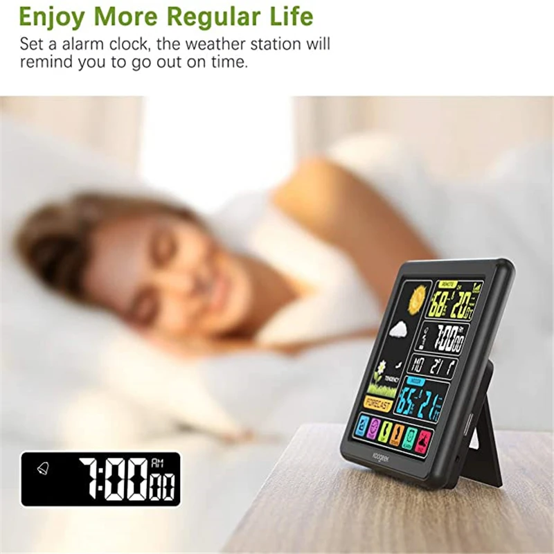 --- Прогноз погоды с 4 различными режимами: солнечная, облачная, частично облачная, дождливая --- 12/24 время и календарь (даты на 7 языках) --- Температура в помещении и на улице (°F или °C) --- Монитор температуры/влажности --- Питание от аккумулятора, подсветка горит в течение 10 секунд. --- Адаптер (входит в комплект) используется для управления полной подсветкой --- Можно подключить до 3 датчиков. --- Дружественный дизайн: 1. Настенное крепление (повесить его на стену) 2. Настольная подставка (легко разместить на столе)