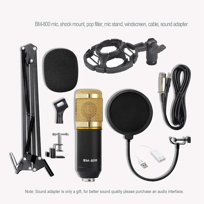 Профессиональное Оборудование студии звукозаписи: оснащен BM-800 микрофоном, амортизирующим креплением, фильтром, регулируемой подвеской микрофона, ножничной подставкой, защитой от ветра, кабелем питания, звуковой картой