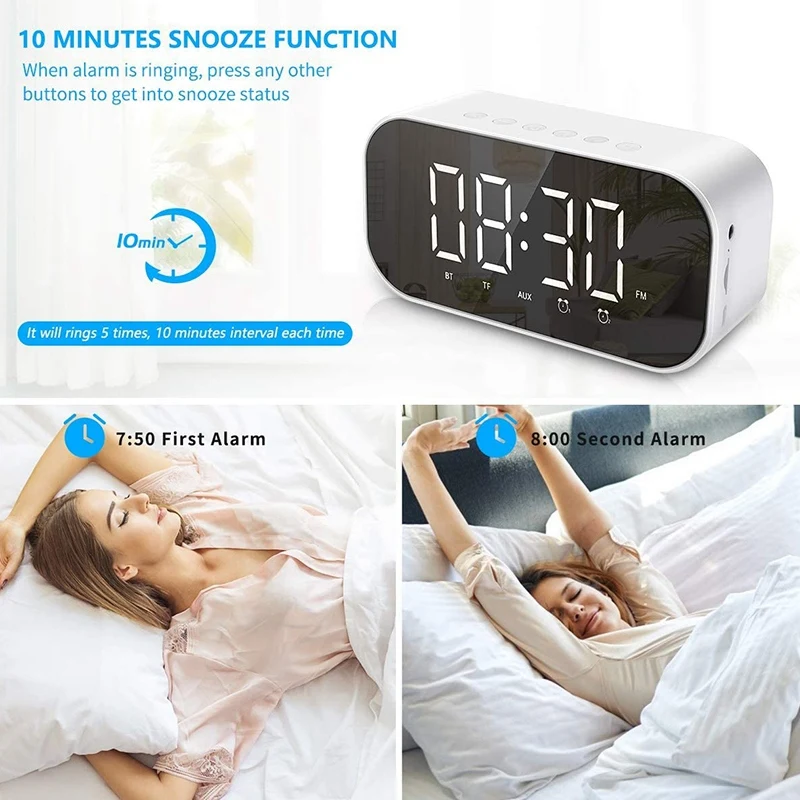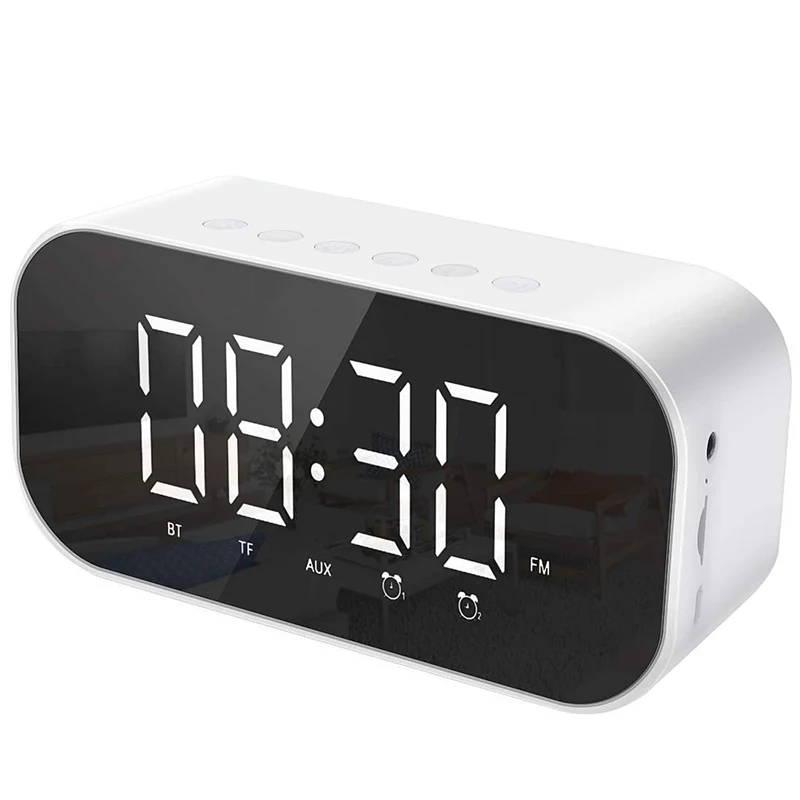 Многофункциональный Будильник-этот прикроватный будильник имеет множество практичных функций, включая беспроводной bluetooth-динамик, fm-радио, tf-карту supprt (до 32 г), воспроизведение AUX, светодиодный дисплей зеркала, двойная сигнализация с повтором, 3 уровня яркости и регулируемым громкостью. Нет 12H настройки.