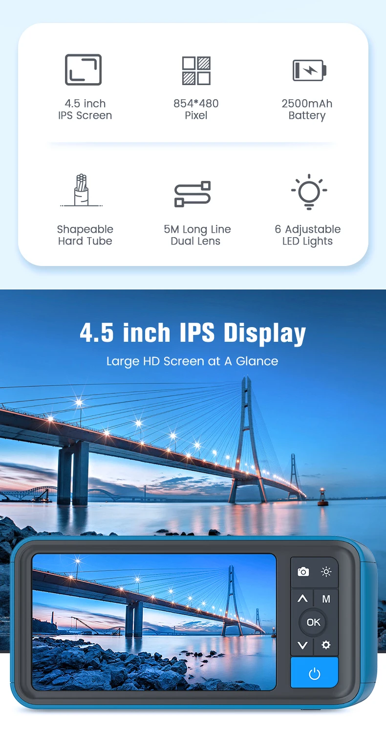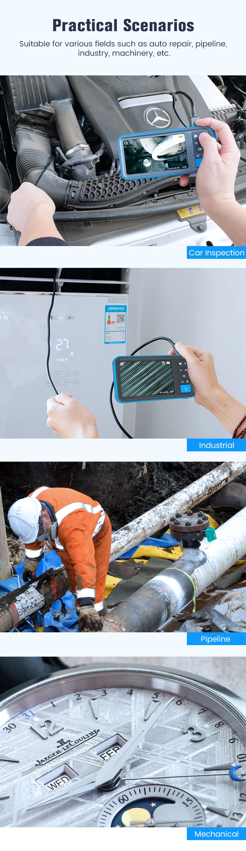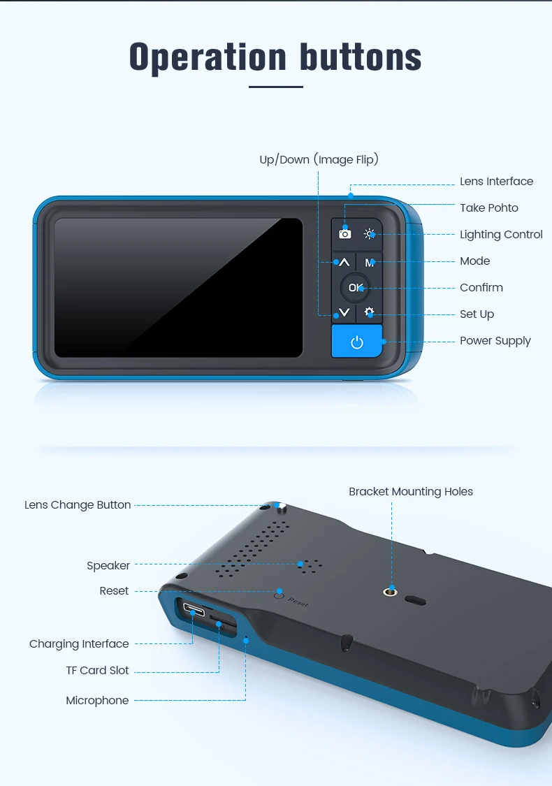 Диаметр: 5,5 мм, 8mmdual Разрешение: 1,0 мегапикселей Угол обзора: 70 ° Глубина поля: 30 мм-100 мм Источник света: 6 регулируемых светодиодов высокой интенсивности