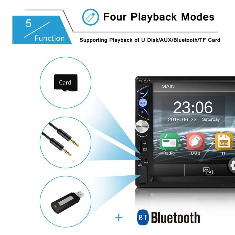 В машине развлечения d он разработан с 7-дюймовым HD прессом sn с пультом дистанционного управления, 1080P видео, APE/FLAC, встроенный MP3, Bluetooth Hands-free, FM радио, часы, поддержка Aux и мультимедийных форматов. 1. Универсальное автомобильное радио, подходит для всех производителей автомобилей, размер 178*100 мм.