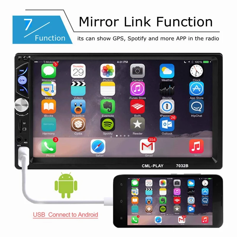 Основная функция: воспроизведение Bluetooth / DVR-вход/зеркальная связь/USB/sd-карта (до 32 Гб) слот/MP5 / FM, А также цифровые медиа с вашего смартфона или других любимых устройств. Mirror Link & DVR вход: это 2 din автомобильная стереосистема поддерживает функцию зеркального соединения телефона android (Поддержка android 8) ,(не поддерживает сам GPS), автоматическое переключение на заднюю камеру при обратном направлении автомобиля