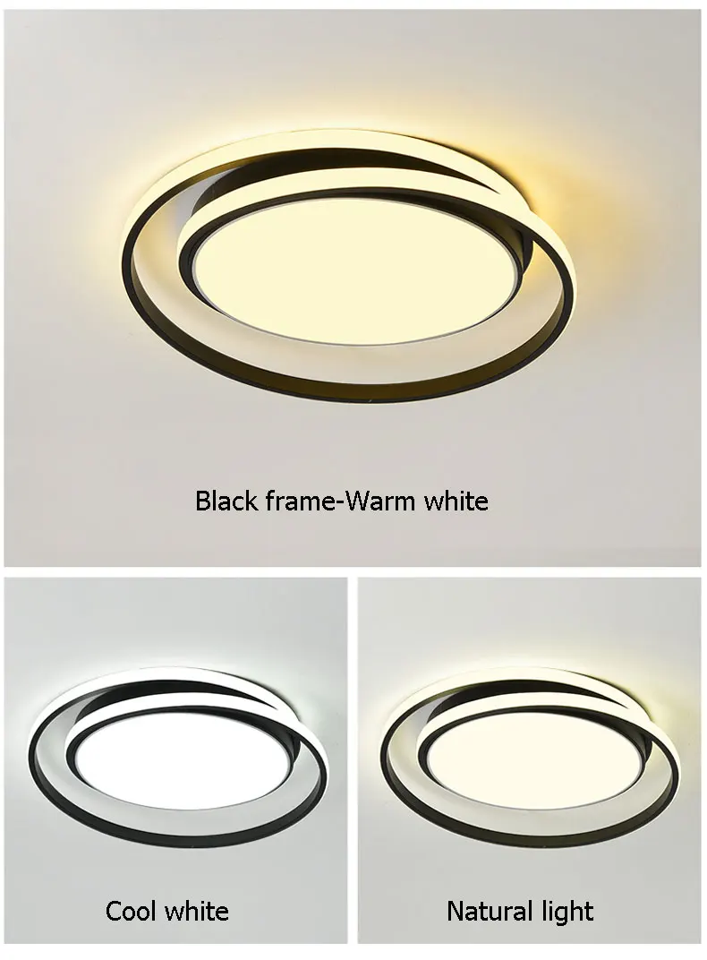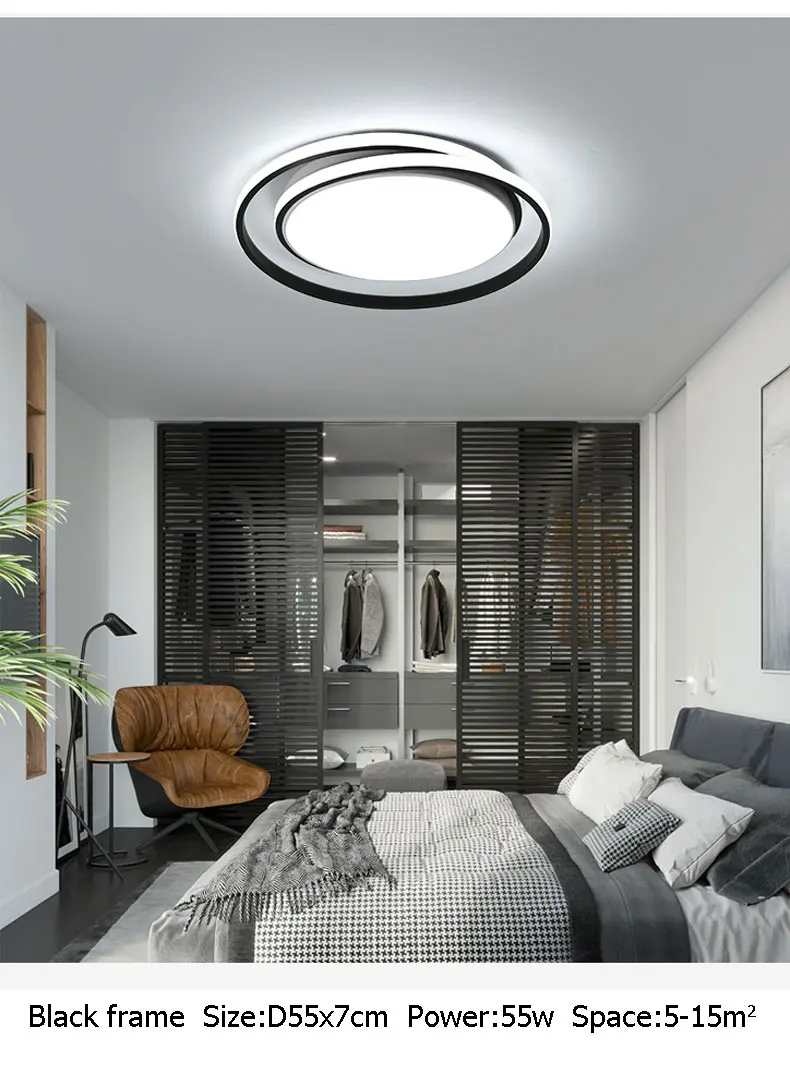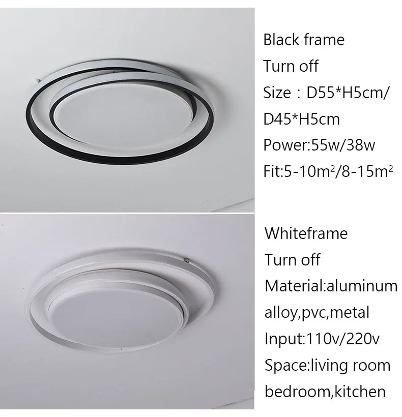 1.Input: 110V / 220V 2.Body color: black frame and white frame 3.Lam size: D55*H5cm Power: 55w Space: 8-15m2 D45*H5cm Power: 38w Space:5-10m2 5.Material:acrylic, pvc cover, aluminum alloy, ,iron, metal body 6.Application:living room,bedroom,dining room ,kitchen chandelier lamp for home 7.Light temperture Warm white,Cool white, Dimmable with rmeote 8.Inculde light source: yes 9.Warranty: one year
