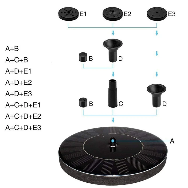 [Различный стиль воды]: есть 6 различных типов головок сопла, прикрепленных к самому насосу. Это помогает изменить высоту воды в различных водных узорах. Примерно 60 см.