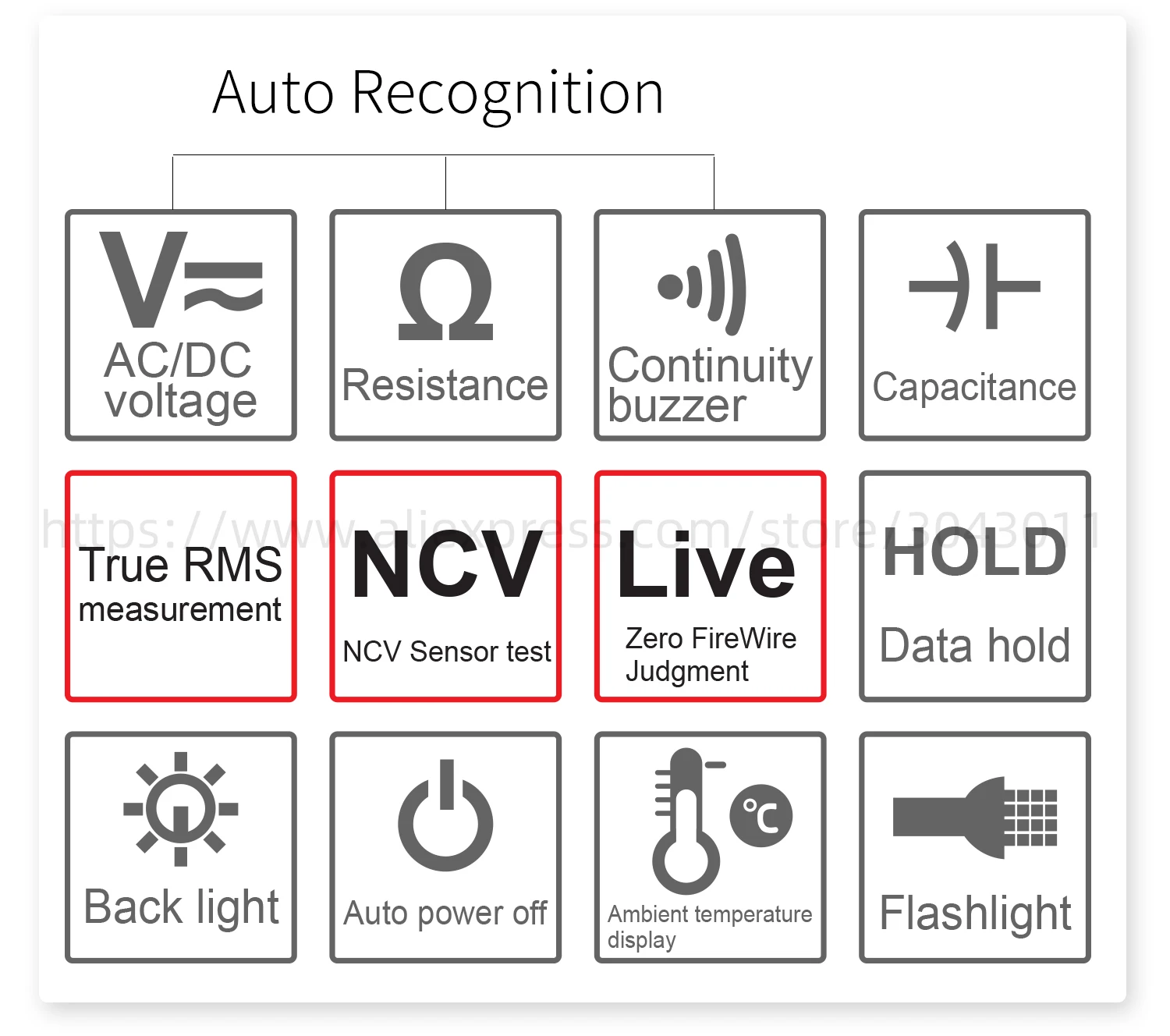 Напряжение постоянного тока DCV: 6 В/60 в/600 В/1000 в Переменное напряжение ACV: 6V/60V/600V/750V Резистор: 600Ω/6k Ω/60k Ω/600k Ω/6M Ω/60MΩ Конденсатор с алюминиевой крышкой: 10nF/100нф/1 мкФ/10 мкФ/100 мкФ/1mF/10mF/60mF Тест на диод/непрерывность: √ Сенсорный ключ: √ Непрерывная мощность: √ NCV : √ Тест на нулевую линию/пожарную линию: √ Полный символ единицы: √ Подсветка ручная/автоматическое выключение: √ Истинное измерение RMS: √ Температура (℃/℉): √ Освещение фонарика: √
