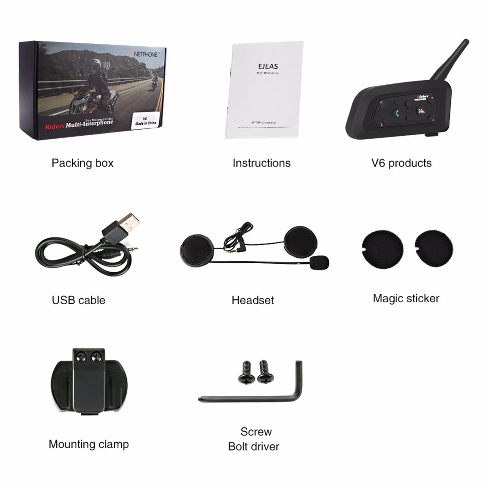 1 x V6 Шлем Интерком мотоцикл Intercomunicador 1 х стерео наушники USB кабель (1 шт.); 1 x зажим для гарнитуры с крепежным винтом Руководство пользователя на английском языке-1 шт.