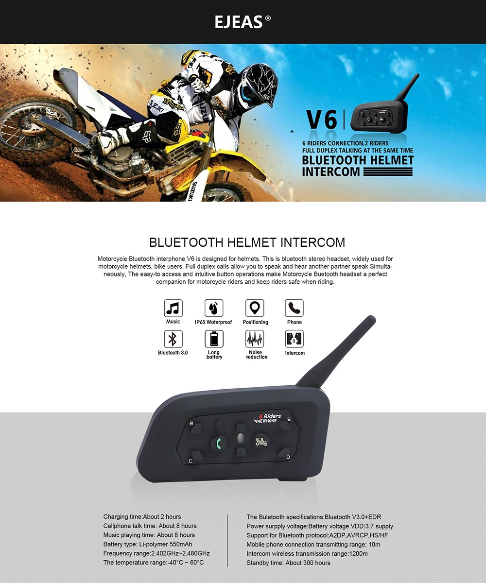 ① V6 Interphone Moto шлем Bluetooth гарнитура Поддержка 6 всадников для подключения, 2 всадника говорят одновременно ② BT Intercomunicador 1200 метров максимальная дальность разговора между 2 гонщиками, полная дуплексная Беспроводная связь, до 120 км/ч шлем гарнитура ③ Беспроводная гарнитура для внутренней связи оставайтесь в паре, если одно устройство выходит из строя, а затем возвращается в диапазон внутренней связи Moto Bluetooth ④ 850 мАч аккумуляторная батарея с длительным сроком службы, 8 часов Bluetooth Интерком ⑤ Мотоцикл Интерком bluetooth безопасный автоприем телефонных звонков Bluetooth Интерком для мотоцикла Enjoy Наслаждайтесь музыкой/аудио инструкцией с вашего мобильного телефона или аудио-мотоциклетной bluetooth-гарнитуры Wind ветер шум DSP подавление Интерком Bluetooth мотоцикл Excellent Отличная производительность для всех видов шлема мотоцикла Bluetooth Интерком ⑩ Идеально подходит для езды на мотоцикле и катания на лыжах; Перчатки дружественная установка Moto FM Bluetooth Интерком