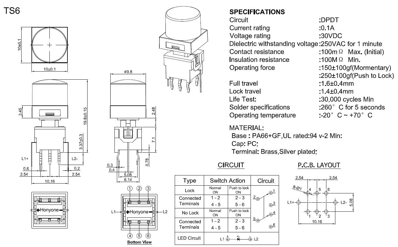 Модель: TS6-A (самоблокирующийся) Действие переключателя: фиксация (блокировка) Схема: DPDT Номинальная мощность переключателя: 0.1A 30VDC Светодиодный рабочее напряжение (макс. 25 мА) Красный: 1,6-2,6 В Зеленый: 2,8-3,6 В Синий: 2,8-3,8 В Белый: 2,8-3,8 В Диаметр кнопки: 10 мм Цвет кнопки: белый Кнопка перемещения: 1,4 ± 0,4 мм (кнопка блокировки) Рабочая сила: 250 ± 100 ГФ Характеристики припоя: 260 ℃ в течение 5 секунд Рабочая температура:-20-70 ℃ Вес: 1,2 г