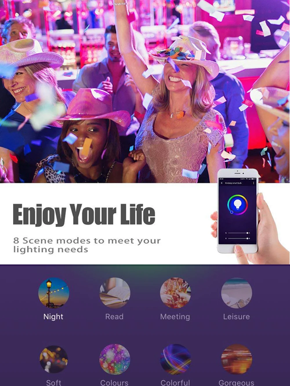 Светодиодный смарт-лампочка может менять цвета в соответствии с музыкальным ритмом и световыми эффектами, чтобы удовлетворить ваши потребности в различной обстановке с помощью функции музыки и микрофона, мы также можем настроить вечерние лампы, фильмы и так далее