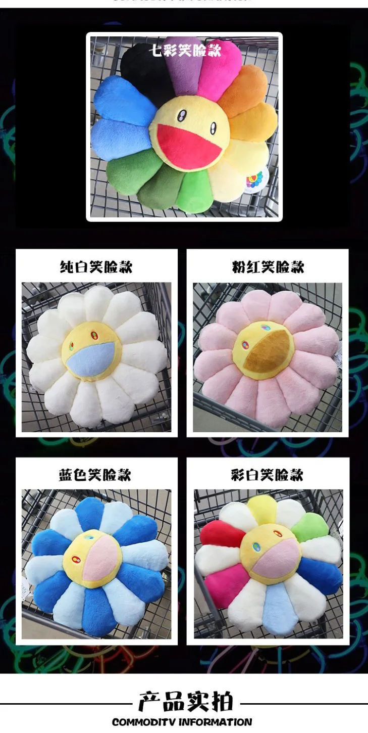 Красочные Такаши Мураками плюшевые подушки Материалы: плюш PP хлопок Размеры: 40 см и 60 см Посылка: opp мешок. Особенности и преимущества: ● Эта красивая игрушка хорошо изготовлена из хлопка PP и плюша, мягких на ощупь. ● Эта плюшевая игрушка имеет милый вид, который идеально используется в качестве подарка для ваших друзей и семьи. ● Он безопасен для кожи, обеспечивает безопасность вашего ребенка во время игры. Обратите внимание: ● Возможны отклонения на 1-3 см вследствие измерений вручную. Пожалуйста, убедитесь, что вы не возражаете до торгов. ● Цвет может отличаться в зависимости от разницы, пожалуйста, поймите.