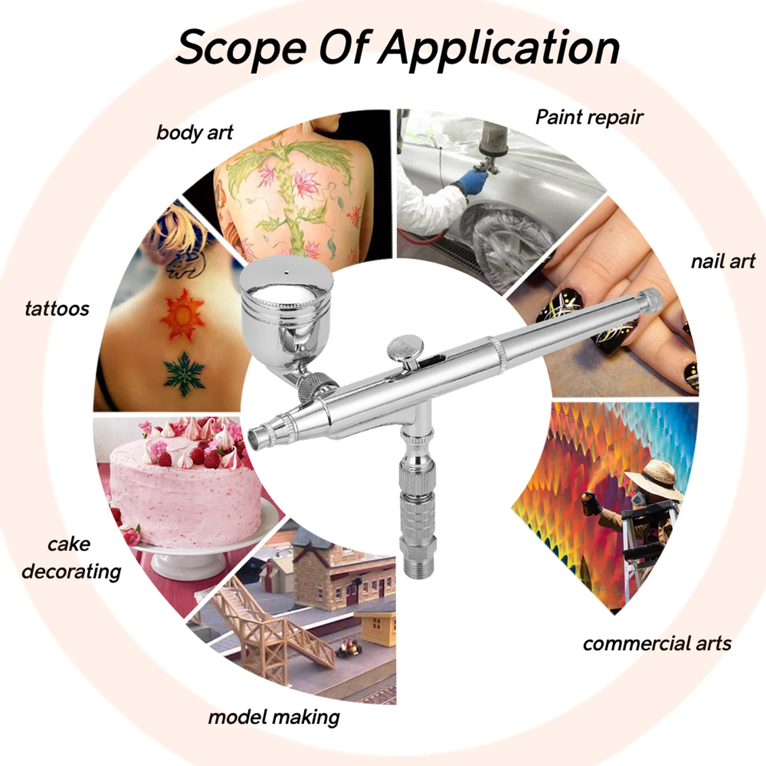 Этот профессиональный набор Аэрограф широко используется в производстве моделей, украшении тортов, татуировках, Нейл-Арте и т. д. Поставляется с одним Аэрограф, 0,2 mmneedle, 0,3 mmneedle (установлен), 0,5 mmneedle, два жидкости чашки 7cc + 22cc, один 0,2 мм сопло, 0,5 мм Насадка, один быстрый адаптер G1/8 и один гаечный ключ. Идеально подходит для художественных работ, коммерческого искусства, боди-арта, дизайнерской живописи, модельной живописи, ретуширования фотографий, хобби и ремесел, моделей и изобразительного искусства, таких как рисование автомобиля, текстиль и футболка.